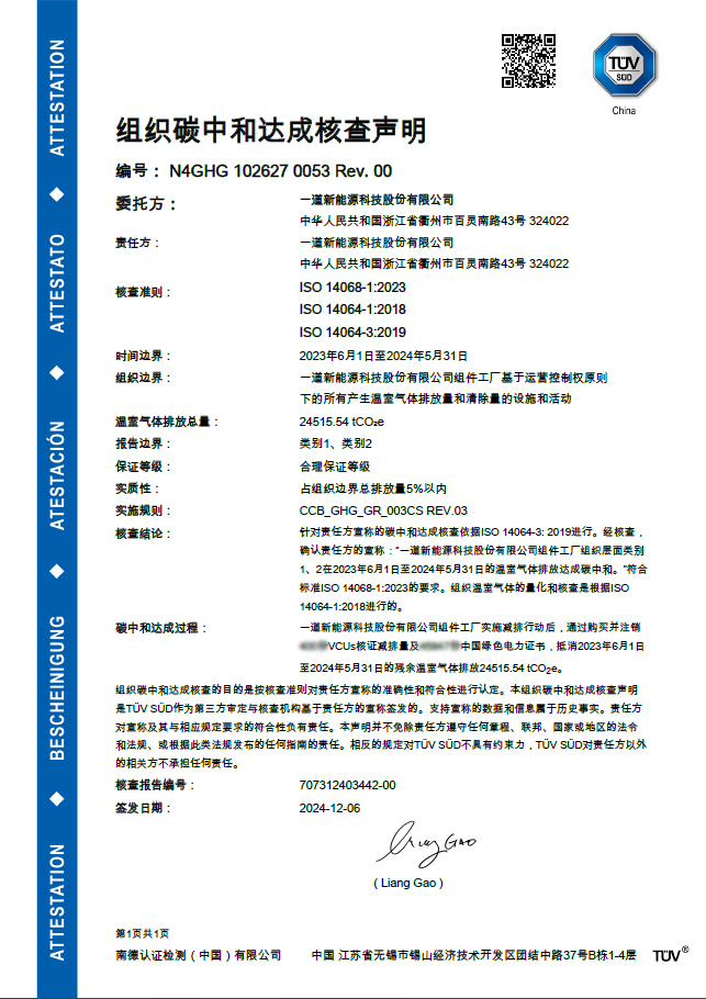 一道新能采取了多元化的碳中和行动,从落地产品和温室气体减排措施、应用节能技术、减碳新技术的开发、使用能源和碳排放智能信息化管理系统、持续提升能源使用效率、废弃物减量、再利用、再循环(3Rs),在可再生能源利用和优化等方面持续发力,能源消耗总量和强度绩效等方面的指标均优于国家、行业能源消耗限额要求。在经过TÜV南德审核专家对文件评审和现场核查等方式,评估了一道新能各项减排行动的降碳贡献及碳信用抵消信息。最终,TÜV南德确认上述工厂在评估期内的运营、排放及抵消情况分别符合IS0 14068-1:2023及《 T/CECA-G 0171-2022 零碳工厂评价规范》认证标准要求,并为一道新能衢州基地组件工厂颁发组织碳中和及零碳工厂认证双证书。
