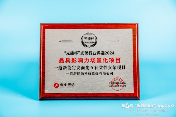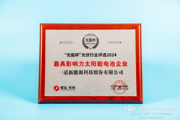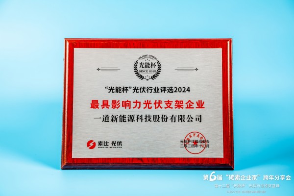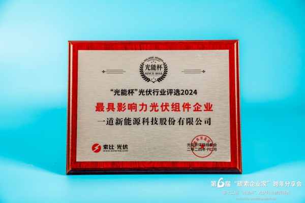 2024年12月25-26日,第六届“碳索企业家”跨年分享会暨第十二届“光能杯”光伏行业颁奖盛典在苏州举行,凭借行业领先的高精尖技术和差异化解决方案,一道新能荣获2024年度最具影响力太阳能电池企业、光伏组件企业、光伏支架企业和场景化项目四项大奖。