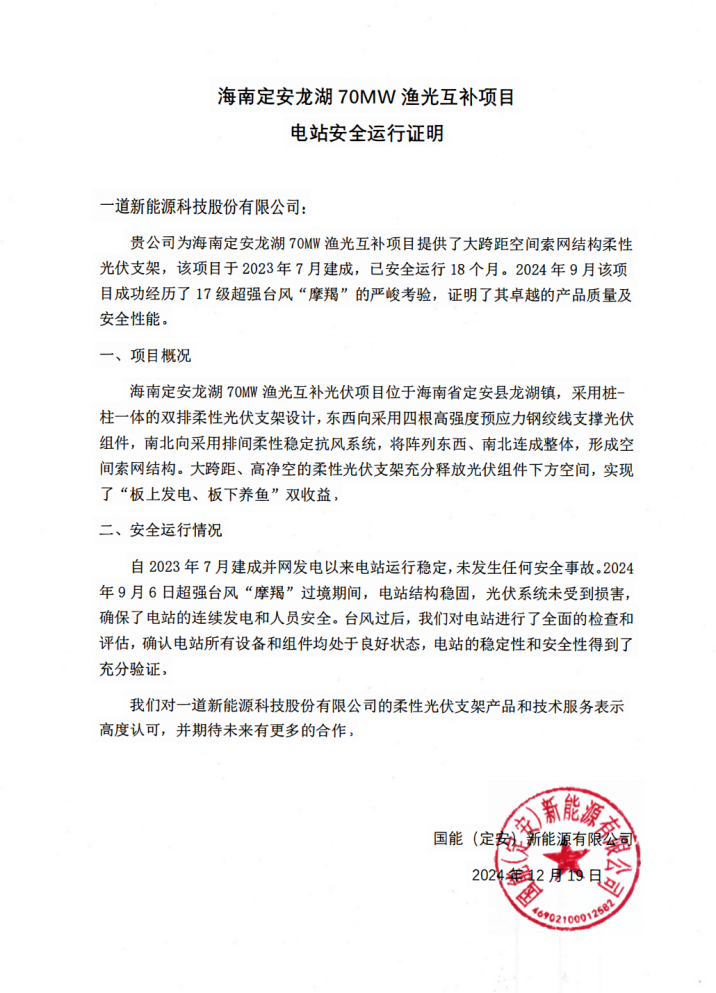 日前,一道新能海南定安龙湖70MW渔光互补项目荣获业主方国能(定安)新能源有限公司颁发的安全运行证明。该项目自2023年7月建成并网发电以来,未发生任何安全事故。2024年9月,该项目成功经受住17级超强台风“摩羯”的严峻考验,再一次彰显了一道新能柔性光伏支架产品的卓越品质和可靠性能。业主方对项目稳定运行和优异表现给予高度评价,并期待与一道新能在未来展开更深层次的合作。