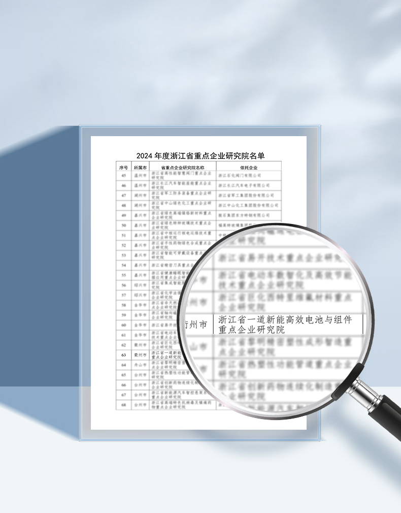 近日,浙江省经济和信息化厅发布公告,公示了2024年度认定的省级重点企业研究院名单,一道新能建设的“浙江省一道新能高效电池与组件重点企业研究院”顺利通过审核、评审以及公示等环节,被认定为2024年浙江省重点企业研究院。这是继2023年被成功认定浙江省企业研究院、浙江省工程研究中心、浙江省企业技术中心之后,一道新能在企业科研平台建设上获得的又一突破。
