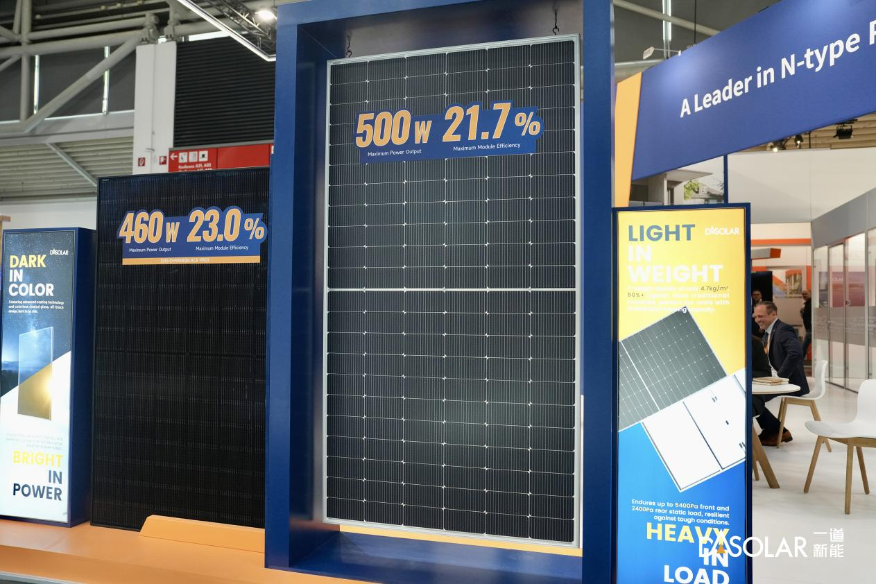 在此次展会现场,一道新能展出的产品有460W DAON全黑系列组件、630W DAON双面双玻矩形组件、470W DBC组件、500W轻质组件、630W自清洁组件等,全面突出了公司在技术创新性、产品可靠性、矩阵差异性的核心竞争力。DAON全黑系列组件产品采用黑电池、黑边框、黑背板、透明背板等客制化选定配置,适用于对外观有极致追求的高端项目。