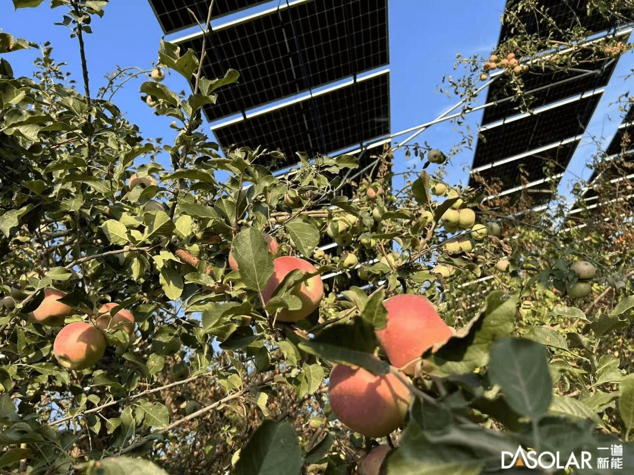 在深秋的陕北高原,苹果树与光伏板支架交错排列,精心计算的间距和倾角让它们在这片土地和谐共生。这里产出的“光伏苹果”甜度丝毫不逊色于普通宜川苹果。我们的另一个光伏柔性支架示范项目坐落于野酸枣树丛生的陡坡,柔性支架巧妙地削峰填谷,克服了10米多的垂直落差,为山坡披上了一层独特的“鳞甲”。酸枣树在支架边结出玛瑙般的果实,这些野生酸枣也被誉为“绿色宝石”,兼具生态、经济和药用价值。光伏与酸枣树相互映衬,共同书写着生态与经济共赢的故事。