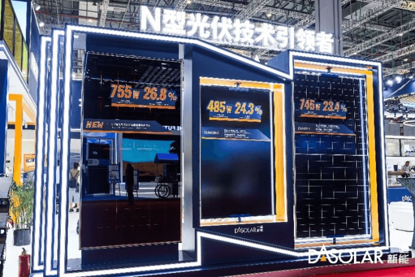 SNEC展出的TOPCon 5.0(右)、DBC 3.0(中)、TSiP 2.0组件(左)