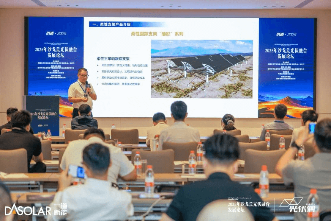 在全球积极应对气候变化、全力推进能源转型与生态保护协同发展的大背景下,2025沙戈荒光伏发展融合论坛于内蒙古鄂尔多斯召开。此次论坛汇聚了行业专家、企业精英以及相关部门领导,共同聚焦沙戈荒地区光伏产业发展,探讨光伏治沙的创新模式与实践路径,为推动我国能源结构优化和生态环境改善出谋划策。一道新能应用技术部总经理何春涛先生受邀出席论坛并作《柔性支架在沙戈荒场景的应用》主题报告,分享了一道新能在光伏治沙领域的前沿技术与宝贵经验。
