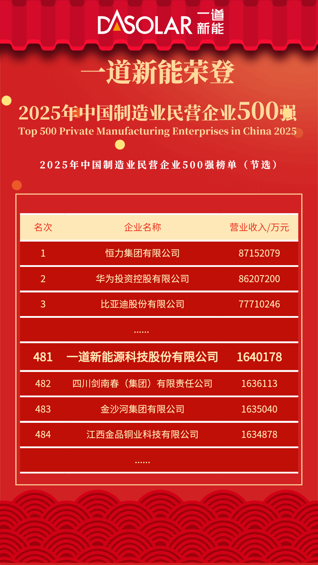 8月28日,全国工商联发布了“2025年中国制造业民营企业500强榜单”。一道新能再度荣耀登榜,位列第481位。这是企业继去年首次跻身中国民营企业500强后,再度上榜并入选中国制造业民营企业500强。