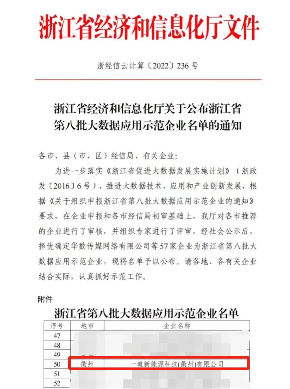 近日,浙江省经济和信息化厅公布“浙江省第八批大数据应用示范企业名单”,一道新能源科技(衢州)有限公司系2022年衢州市唯一一家成功入选的企业。这标志着一道新能通过四年蓬勃的发展,已经在生产智能化、管理数字化、数据价值化等方面取得了积极成效。